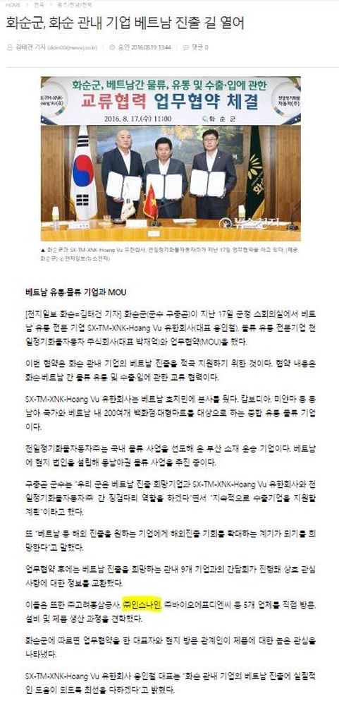 신문 화순군, 화순 관내 기업 베트남 진출 길 열어 페이지 정보 작성자 관리자 댓글 0건 조회 413회 작성일 22-10-21 06:02 목록 본문 2016 천지일보베트남 유통, 물류 기업과 MOU 이전글고흥 연홍도 국내 유일 섬 전체 미술관 조성 22.10.21 다음글인스나인, 지역 넘어 세계 시장 진출한다. 22.10.21