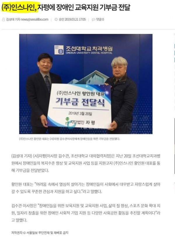 신문 (주)인스나인, 자평에 장애인 교육지원 기부금 전달